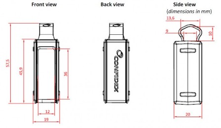 - Dimensões: 57,5 x 19 x 20 mm