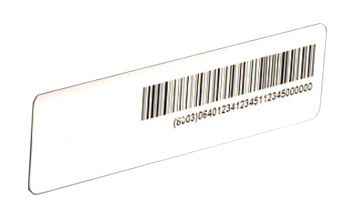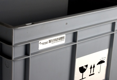 Etiqueta lavável, para superfícies de plástico, com espaço de impressão para dados, podendo ser codificada e impressa com impressoras RFID.